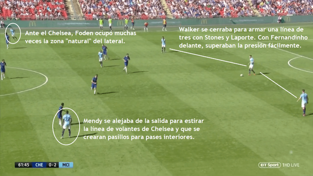 En cuanto al cambio de “carril” entre los dos partidos, es posible que su posición ante el Chelsea haya sido causada por dos factores: estirar a la línea de volantes para abrir espacios y que Silva y Foden pudieran recibir detrás, más la dificultad de Fàbregas para bascular y cubrir la espalda de Pedro cuando iba a presionar.