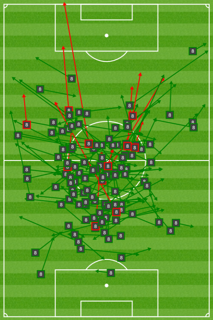 Ese ejercicio defensivo fue un desafío complicado para el PSG, ya que le costó conectarse con los jugadores más capacitados para generar en tres cuartos del campo y dar el último toque. Una prueba de esa dificultad para filtrar entre líneas está en los pocos envíos que pudieron enviar detrás del doble 5 Verratti y, sobre todo, Paredes, dos futbolistas que se destacan por su visión y precisión para verticalizar: con 147 y 141 intervenciones, respectivamente, completaron 115/126 y 111/122 pases, pero pudieron jugar poco a zonas centrales.
