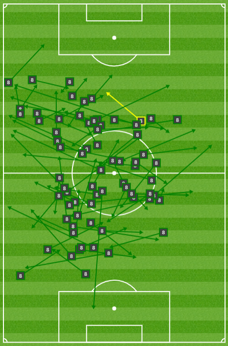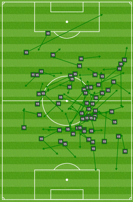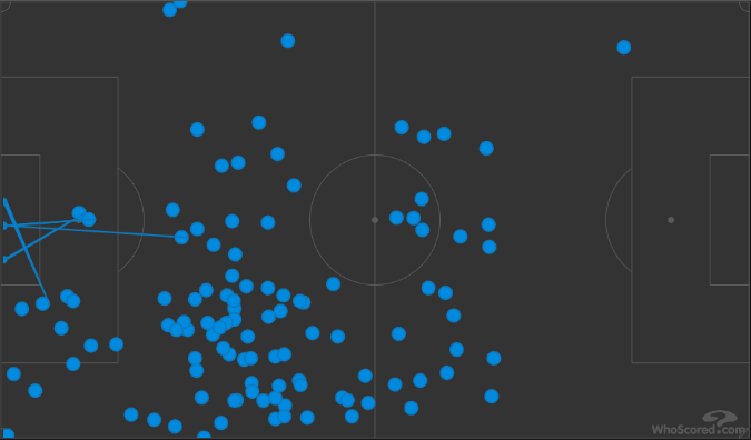 Principalmente porque, al no poder recibir tanto en la zona central y alrededor del doble 5 como en encuentros anteriores, muchas veces tomó contacto con la pelota lejos del arco de Matthieu Dreyer (ver abajo). Luego, porque el ataque se concentró casi exclusivamente por la izquierda, con apenas un 21% de avances por derecha en los 90′ ( y 18% en los 45′ iniciales), lo que redujo los focos de atención y minimizó las posibles apariciones sorpresivas por la derecha como lado débil (lo que sucedió, por ejemplo, en dos de los cuatro tantos al Montpellier).