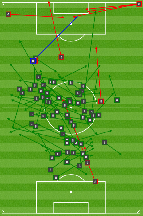 El mediocentro español, termómetro del juego del Barcelona, estuvo vigilado y participó poco para organizar: en los 78′ que disputó intervino 58 veces, número muy por debajo de su promedio en Champions (llegaba con 54 en 44,5′ de media, lo que se traduce en 94,6 por 78′). Además, los dirigidos por Pochettino demostraron mucha disciplina para reducir los espacios entre defensa y mediocampo y hubo una gran tarea de los volantes (principalmente, Paredes, Verratti y Ander Herrera) para evitar que se filtraran pelotas a su espalda, relojeando constantemente para bloquear líneas de pase (ver abajo).