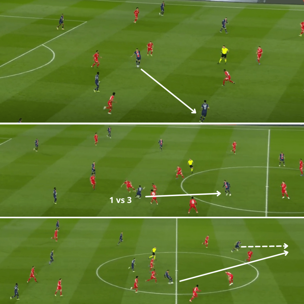 Desde sus características se preveía que podía ayudar a alterar esa dinámica y así fue: con personalidad y serenidad, contribuyó a modificar la postura para que el equipo manejara más la pelota y resolvió con prestancia varias situaciones bajo presión. Su impacto se refleja en varios datos de posesión con respecto a la ida: el porcentaje del conjunto parisino subió un 8,2% (de 36,4% a 44,6%), los mediocampsitas centrales tuvieron más de un 2% más (de 3,5% de Danilo Pereira en sus 30′ en el medio, 3,6% de Ander Herrera y 4,6% de Idrissa Gueye a 5,7% de él y 4,6% de Gueye) y los cuatro atacantes (Ángel Di María, Neymar, Julian Draxler y Kylian Mbappé) mejoraron 4,2% (de 10,3% a 14,5%).
