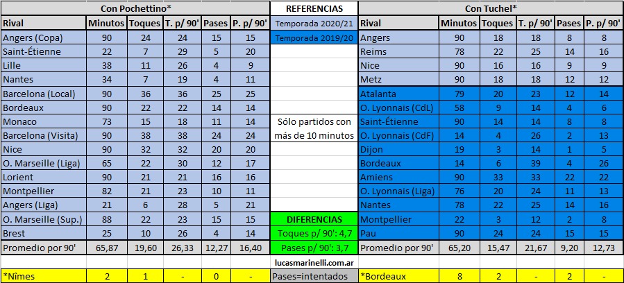 Esto se dio sobre todo desde su paso al Inter, ya que con la camiseta de la Sampdoria tiene un enfrentamiento con la Juventus en el que tomó contacto con la pelota 40 veces (sólo en tres ocasiones en el área) y convirtió dos goles, por ejemplo. Pero esos rasgos, que quedaron claros en su primera temporada en el PSG (en la Ligue 1 promedió 14,6 toques en 63 minutos, con 18,6 en 69′ en Champions), han empezado a cambiar: en los 15 partidos con más de 10′ que lleva disputados con Pochettino ha tenido 26,33 intervenciones por 90′ (19,60 en 66′) y ha dado 16,40 pases por 90′, un salto de 4,70 y 3,70, respectivamente, con los últimos 15 con al menos 10′ que jugó (sólo cuatro en la 20/21) con Thomas Tuchel (21,67 y 12,73 en cada rubro por 90′). El desglose de los datos: