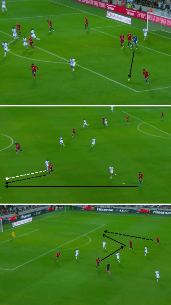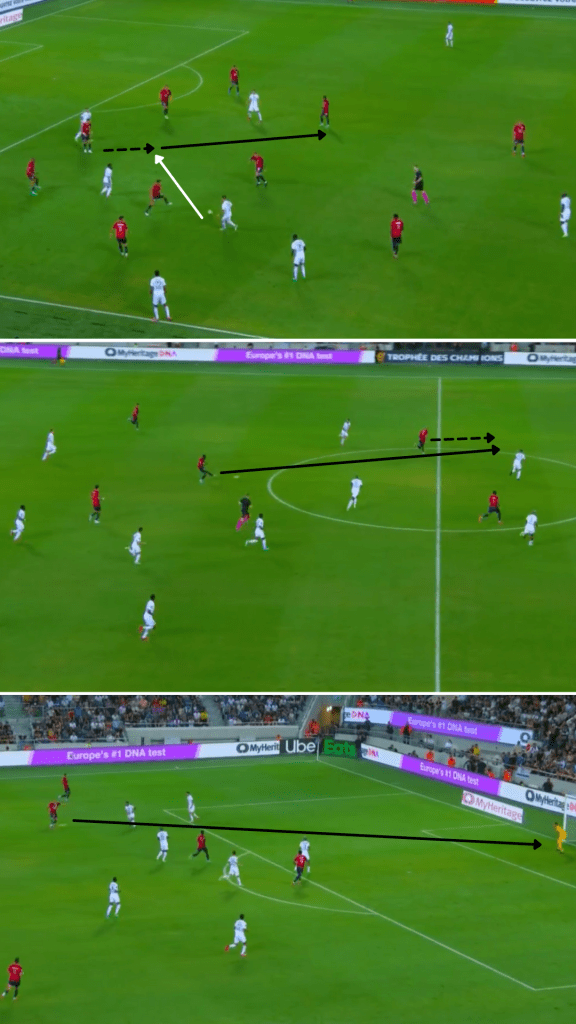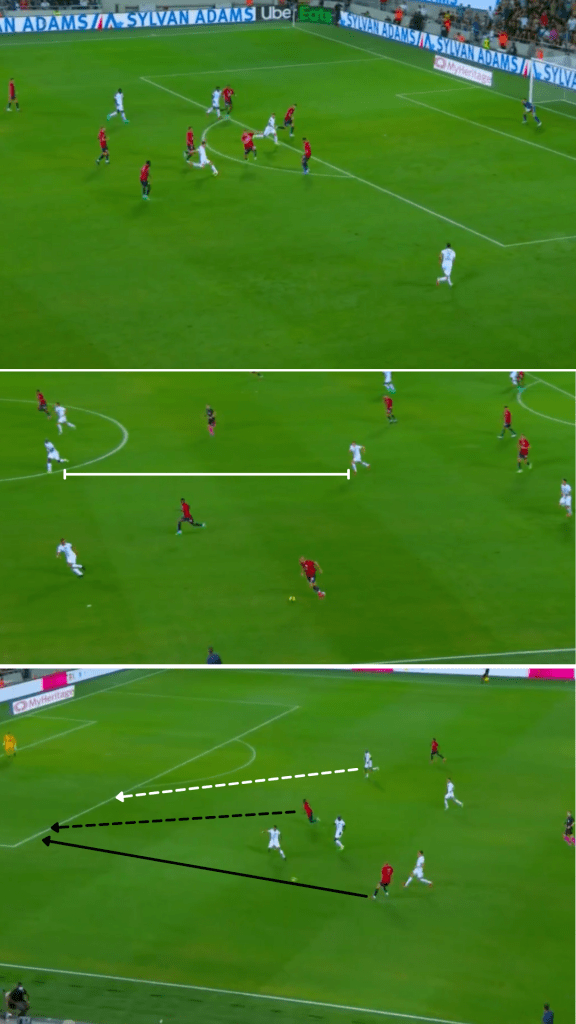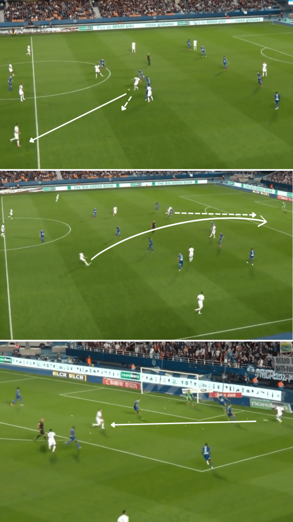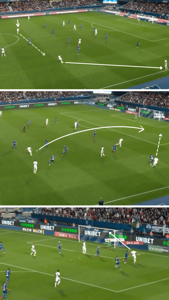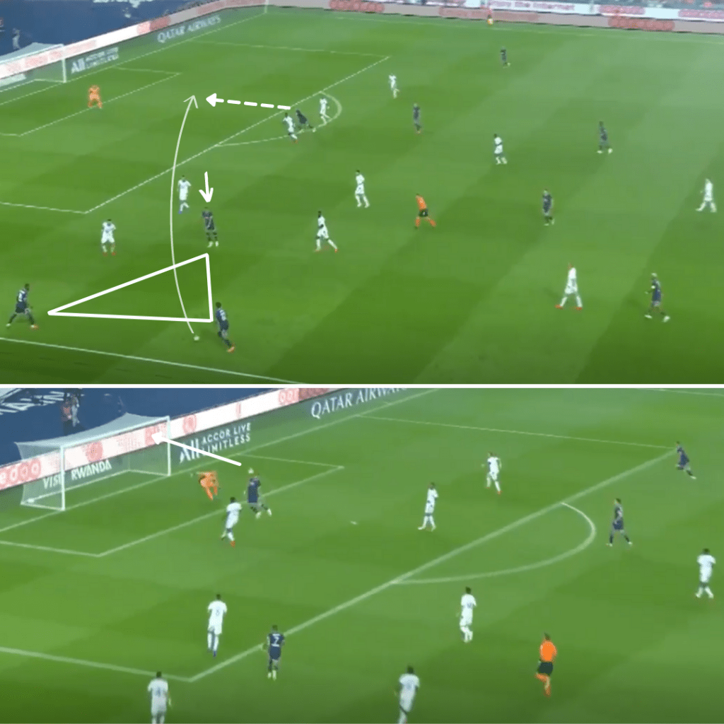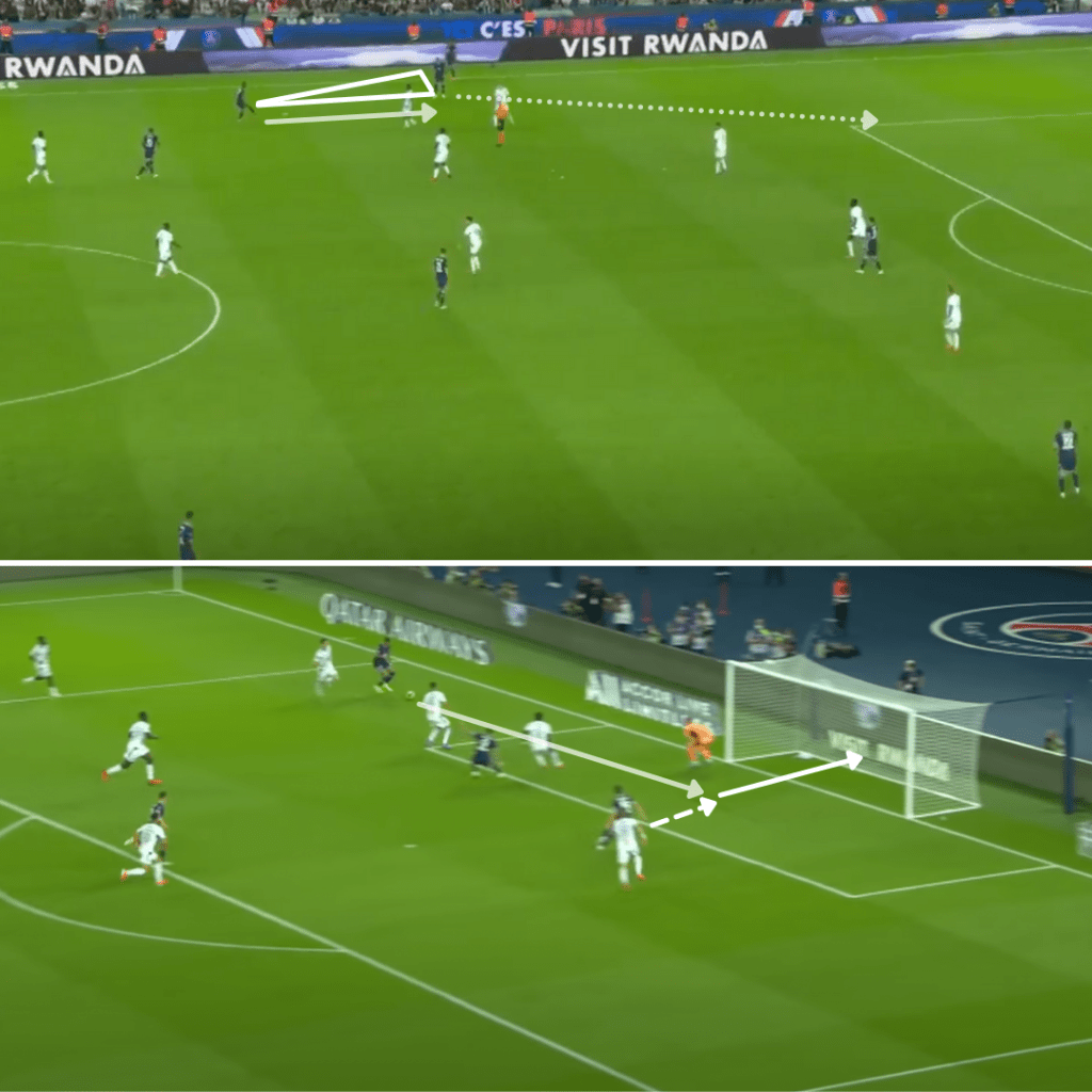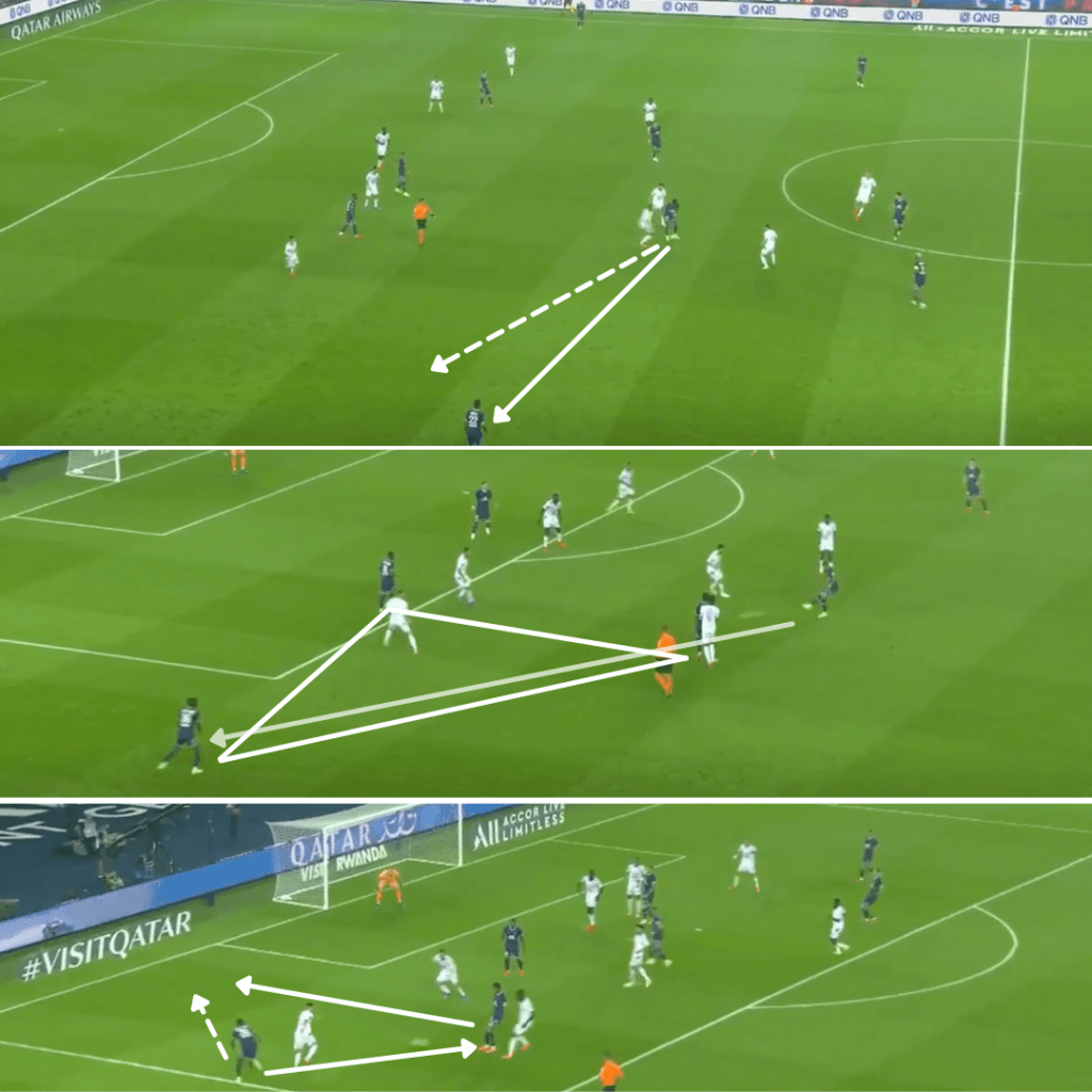 Al contar con dos extremos de perfil interior como Rafinha y Draxler, las salidas del conjunto parisino muchas veces llegaron a un sector lateral -sobre todo en la izquierda, con Kimpembe y Diallo- sin que hubiera una alternativa de pase por delante, lo que obligaba al poseedor a desprenderse del balón sin un destino claro o a intentar una conducción con pocas probabilidades de éxito. Sin embargo, pudo resolver ese inconveniente alrededor de los 15′, al abrir a los dos atacantes externos para que se ofrecieran y sirvieran de apoyo para poner a un compañero -en especial a un mediocampista- de frente y con panorama para progresar (ver abajo). En esas jugadas, al igual que en los cambios de frente para aprovechar la cantidad de rivales que se acumulaban en el lado activo, encontró las soluciones para contrarrestar la estrategia de los de Pascal Gastien.