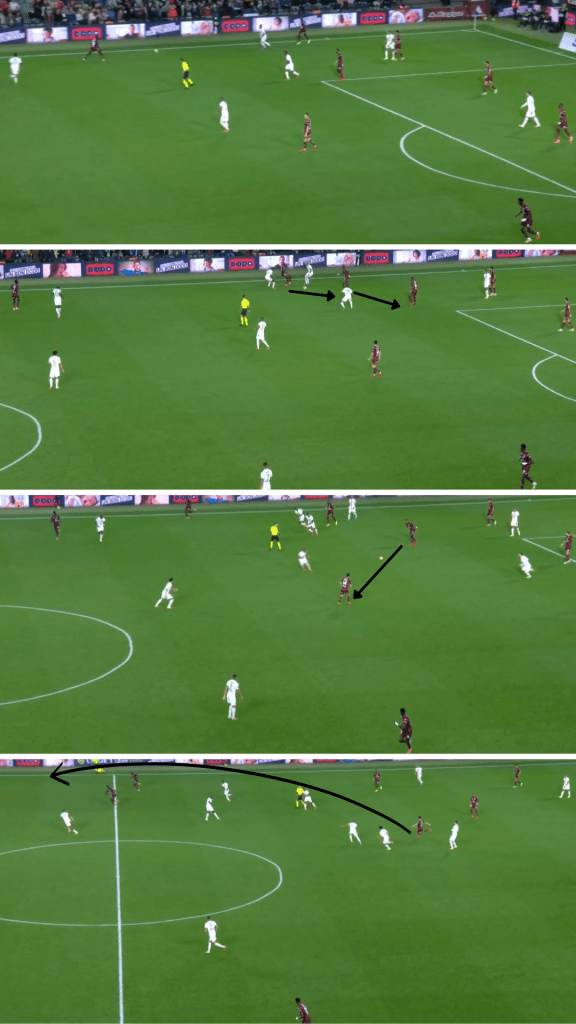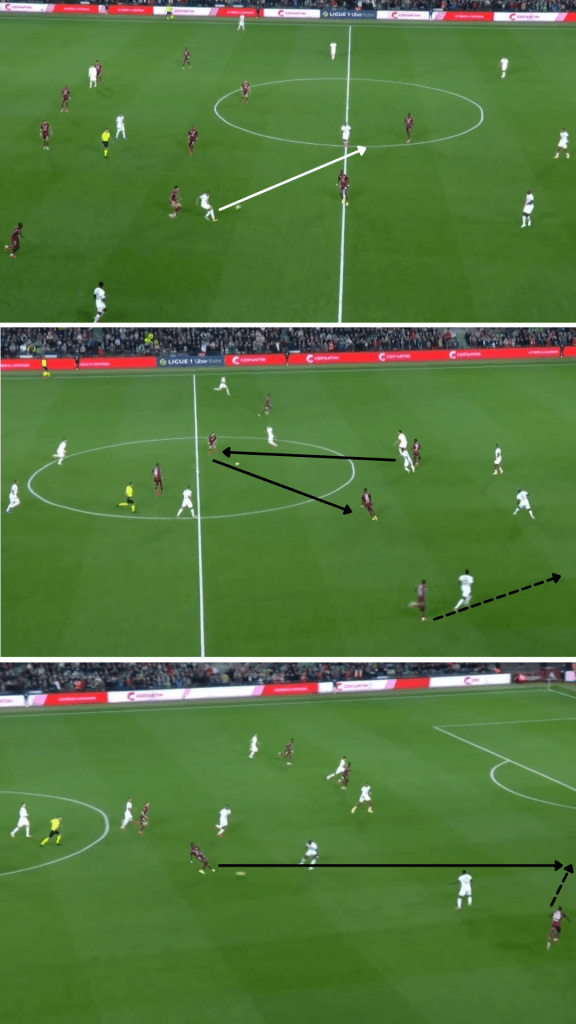 En el primer partido de la 2021/22 con dos laterales de mentalidad atacante, algo que Pochettino también había mencionado en la conferencia previa («Está claro que vamos a poder jugar en el futuro, porque ésa es la idea, con dos jugadores ofensivos en los carriles. Pero viendo los estados de forma, a veces hemos optado por jugar con Abdou Diallo o Thilo Kehrer, dependiendo de dónde queramos atacar con un jugador ofensivo de banda como Ángel Di María o con Ney yendo adentro entre líneas, jugando más en pasillos centrales, para darle la posibilidad a Nuno de que suba mientras tenemos equilibrio en las vigilancias», dijo), la distribución en 4-3-1-2 (con momentos de 4-3-2-1) les regaló las bandas y buscó compensarlos con el mediocampista central y, frecuentemente, uno de los interiores. Con Danilo Pereira (una inclusión que quizás se debió a darles más ayuda a los centrales en esta prueba inicial, dado que el portugués -que fue de los puntos más bajos- es un jugador más enfocado en la recuperación que Leandro Paredes) y Georginio Wijnaldum (quien no termina de encontrar su lugar) para formar un 2+2, 3+1 o 3+2 (cuando Rafinha retrocedía más), el PSG contó con respaldo para las proyecciones de Achraf Hakimi y Nuno Mendes y superioridad para salir con facilidad.