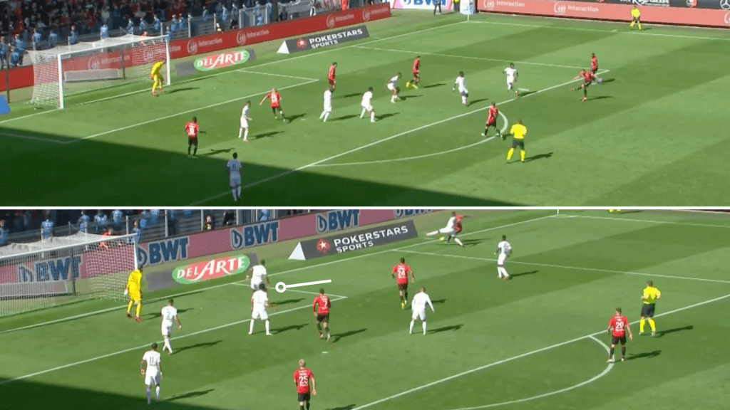 Sin terminar muchas acciones (en un saque de arco, un lateral o una falta, lo que permite reacomodarse al haber una interrupción en el juego) o ceder la posesión en el último tercio (el oponente está «hundido» y debe elaborar más para iniciar una réplica, además de que los esfuerzos para volver a ganar el esférico suelen ser más cortos), la falta de trabajo hacia atrás de los delanteros -entendible por sus características- provocó más de un desajuste. Si frente al Montpellier o el Manchester City los tres mediocampistas debieron redoblar esfuerzos para ayudar a los laterales y disminuir el peligro, en el Roazhon Park la exigencia sobre Idrissa Gueye y Marco Verratti aumentó y, entonces, los espacios otorgados fueron mayores. El local lo supo aprovechar con avances directos o por los costados: en general buscó atacar con velocidad o por las bandas (una de sus características) para sacar ventaja de cómo los de Pochettino solían partirse en un bloque de seis y otro de cuatro.