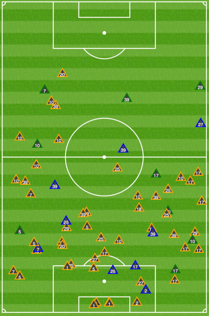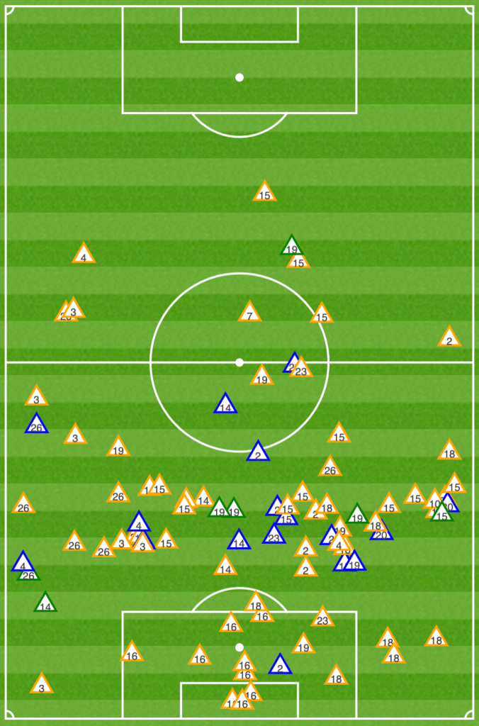 Sin embargo, la alineación de cuatro delanteros también conllevó sus complicaciones. Con una escasa activación para presionar tras pérdida y un lento retroceso, varias veces el conjunto parisino ofreció muchos huecos en su transición defensiva. Las principales equivocaciones llegaron de parte de Neymar y Di María: fueron los dos futbolistas que más perdieron el balón en el partido, en 22 y 20 ocasiones (de 83 y 67 intervenciones, respectivamente); si bien es lógico que se den esos números en atacantes porque son quienes más arriesgan, tuvieron errores en zonas más retrasadas (como el brasileño en el primer gol). Eso complicó aún más la vuelta, al tener varios jugadores por delante de la línea de la pelota -y, por ende, eliminados rápidamente de la jugada- y al adversario de frente y con panorama para lastimar. Así, el Rennes pudo contraatacar con bastante facilidad, ya que logró varias recuperaciones en el tercio medio (ver arriba, fue el rival que más arriba quitó de los últimos cuatro del PSG en la Ligue 1) y con poca resistencia hasta plantarse en las cercanías de Gianluigi Donnarumma.