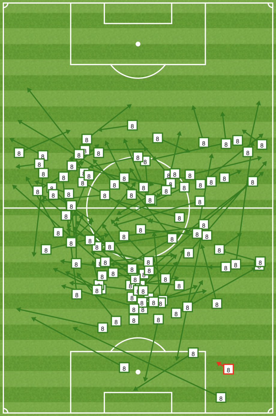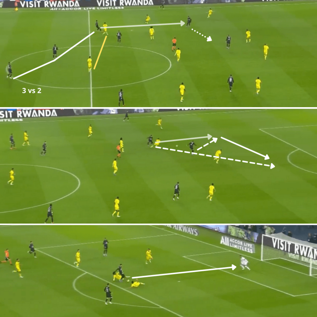 En ese volumen de juego influyeron mucho Leandro Paredes y Marco Verratti, una dupla que se sumó en su totalidad -con los dos en cancha- al tridente por primera vez. Ambos participaron mucho (terminaron segundos y terceros en la lista de toques, con 110 y 102, en 75′, respectivamente) y fueron importantes para el nivel de la tenencia. El italiano lo hizo desde su capacidad para sostener la pelota e ir juntando a sus compañeros, mientras que el argentino lo hizo desde su distribución: completó 105/106 pases (con 4/4 en los largos) y, según fbref.com, estos representaron 658,4 metros progresados hacia el arco rival (es decir: entre todos sus envíos dirigidos hacia la portería contraria, la pelota avanzó esa distancia entre las posiciones de inicio y de destino); este número, que refleja la capacidad del ex Zenit para filtrar, es más alto que el que acostumbra, ya que en sus tres apariciones anteriores en esta temporada promediaba 352,6 m. por 90′ y en sus otras tres campañas en Paris sus medias por 90′ fueron de 440,4, 490,3 y 477,7 m. En general partiendo como tercer central, lo que garantizó una superioridad numérica de tres contra dos para iniciar, varias veces se conectó con un compañero entre líneas (como con Messi en el segundo gol) y permitió superar al mediocampo del Nantes con facilidad.