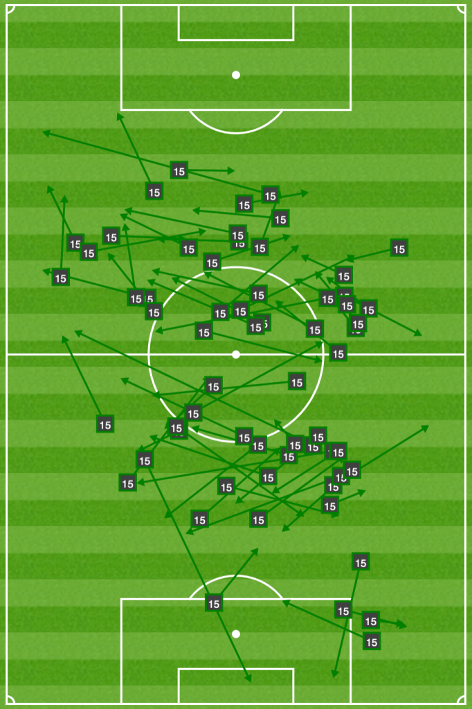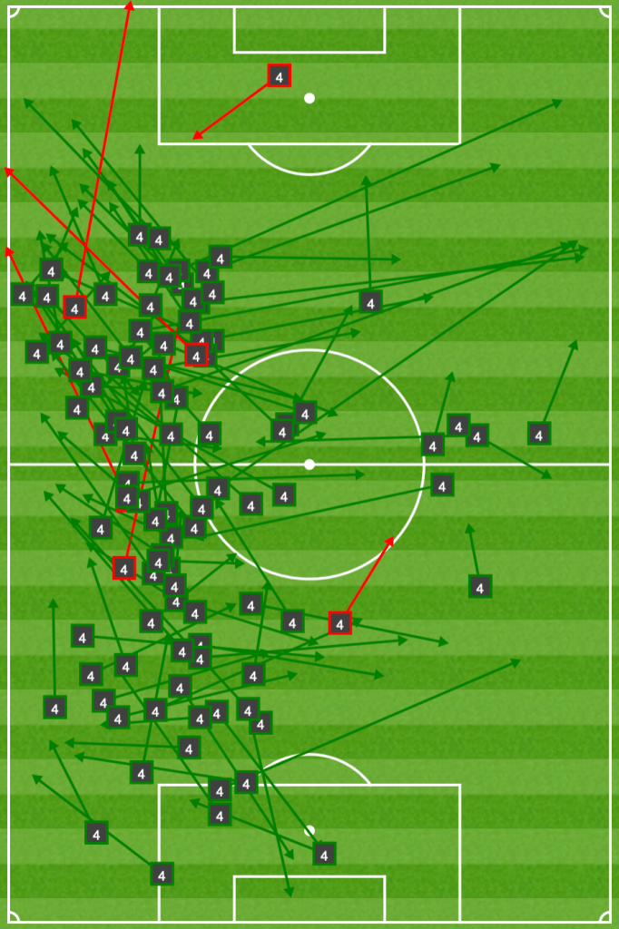 Esos circuitos ofensivos estuvieron favorecidos por lo bien que les llegó la pelota desde atrás, un aspecto en el que Ramos jugó un papel destacado. A falta de ver cuál puede ser su impacto a nivel defensivo (tuvo acciones positivas, pero no fue muy exigido), en su primera aparición quedó claro que en la distribución representa un salto de calidad: mostró precisión (completó 95/101 pases, más que cualquier otro futbolista), resolvió con jerarquía las pocas situaciones de presión alta que enfrentó y le dio agilidad a la tenencia, sumando un recurso importante con sus cambios de frente (siete de sus nueve envíos largos fueron exitosos). Aunque Presnel Kimpembe también puede aportar en esta faceta (ser zurdo representa otra variante y es de uno de los centrales del plantel que más conducen), el español y Marquinhos sobresalieron en la primera fase de las jugadas. Su influencia fue tal que, junto con los descensos de Di María y Messi, hasta disimularon la falta de un mediocampista de juego, ya que Idrissa Gueye (quien redondeó una actuación completa) y, sobre todo, Danilo Pereira no se caracterizan por ser dúctiles en el manejo (ver abajo).