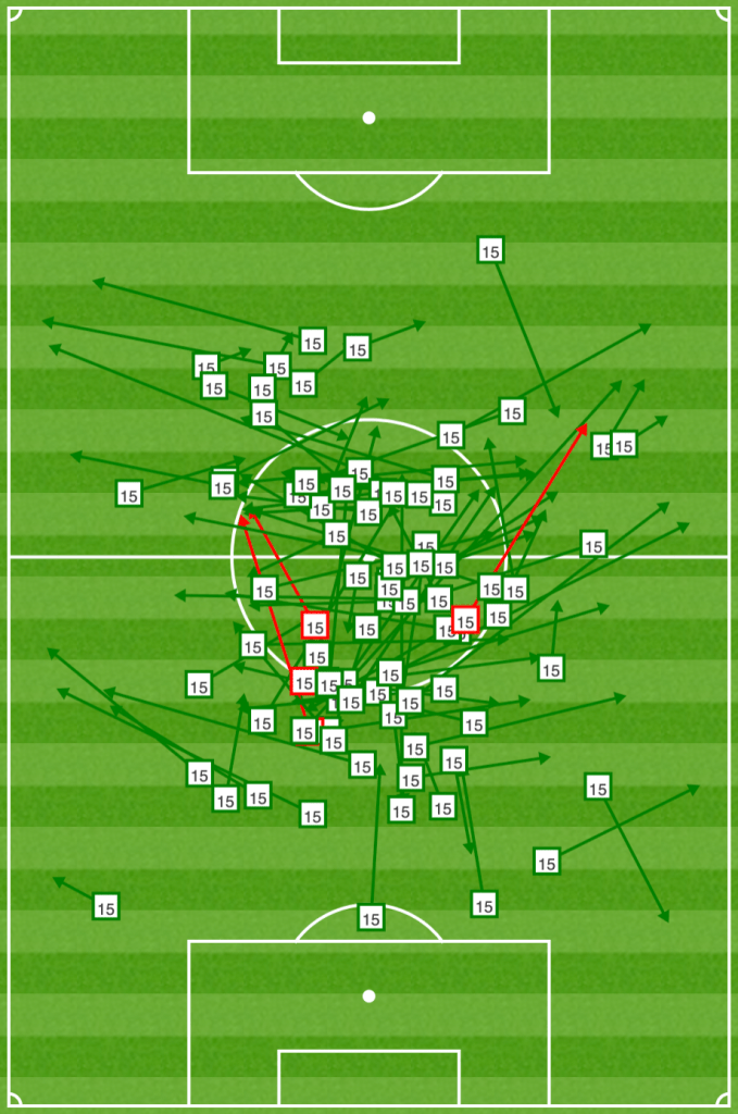 Este último punto tuvo cierta lógica por el perfil de los tres titulares. Porque ni Pereira, ni Gueye ni Dina Ebimbe se caracterizan por su capacidad para jugar pases precisos hacia las cercanías del área o para encontrar a un compañero entre líneas, algo que se vio durante el encuentro (ver abajo). Ante un 4-4-2 tan compacto, sincronizado y efectivo como el que planteó el Nice, esas entregas son esenciales -sobre todo si en equipo hay jugadores que saben desenvolverse en espacios reducidos, como es el caso- para ganar zonas clave, forzar desajustes y dar vuelta al adversario para que no defienda de frente. Esto se dio poco en el PSG, que giró a los defensores más en los carriles externos que en los internos.