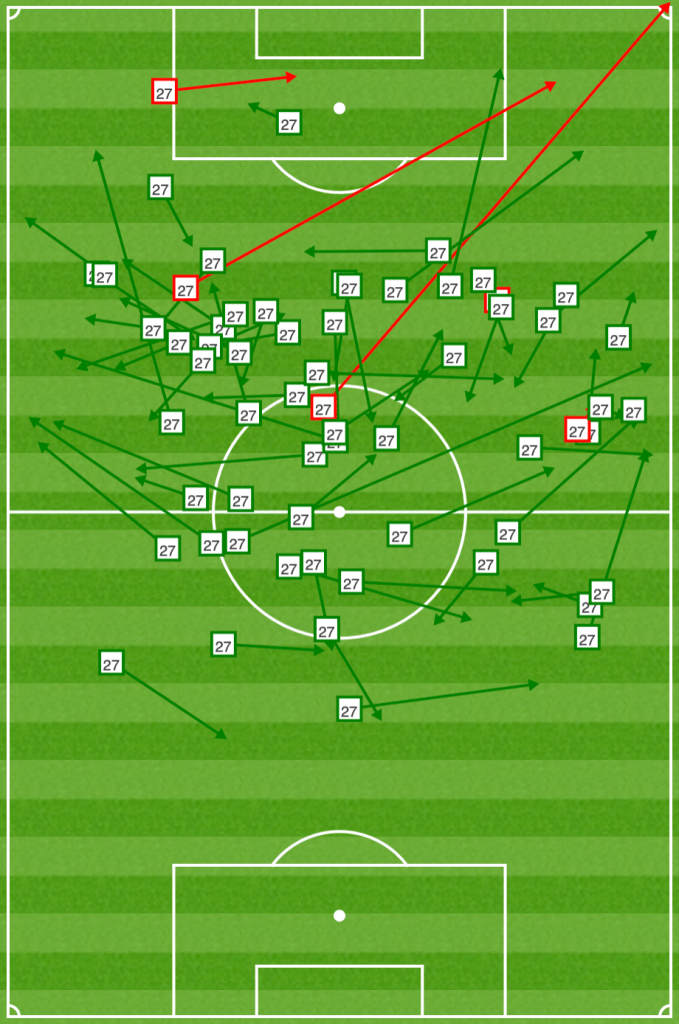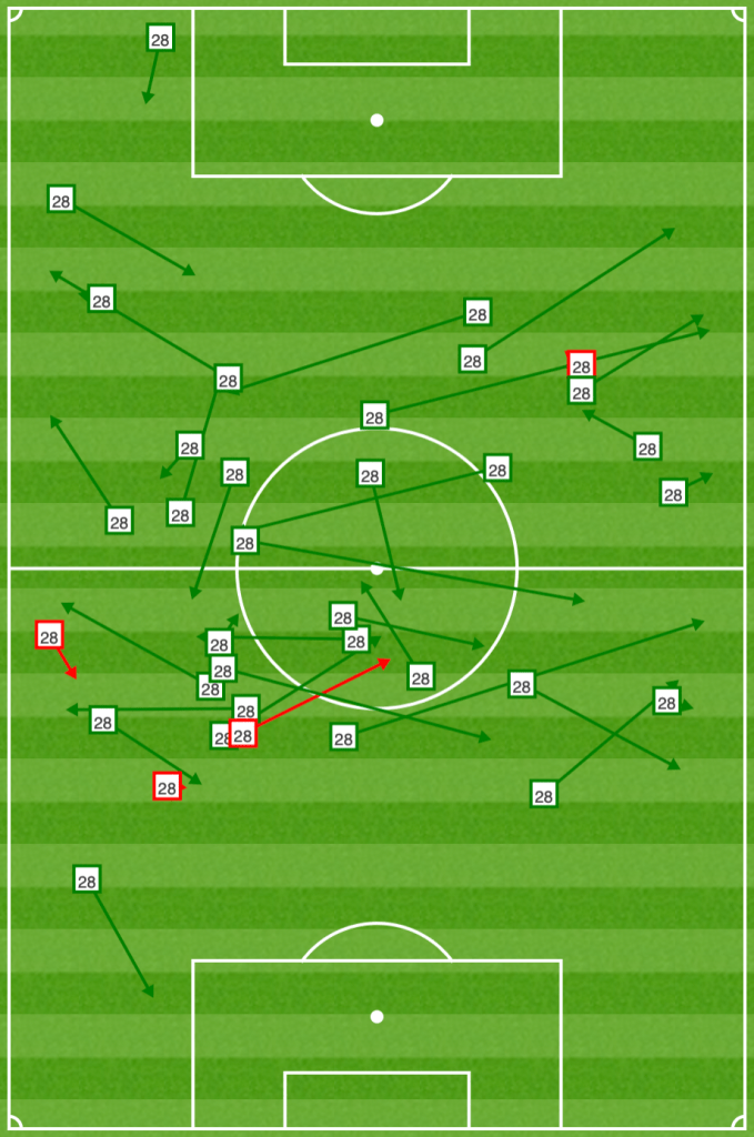 Sin embargo, sí consiguió que algunas de las salidas externas se tradujeran en situaciones, como cerca del cierre del primer tiempo (ver arriba) o en el segundo en la acción que derivó en el mano a mano de Di María. Para poder crear peligro de esta manera con más regularidad le faltó un paso adelante de su mediocampo: aparte de en mayor presencia ofensiva para compensar al falso 9 (Pep Guardiola, quien retomó el uso de esa función, dice que más que una posición es un espacio que se deja vacío para que lo ocupe otro jugador), el equipo también extrañó otro compromiso en la tenencia (tanto en la velocidad de los cambios de lado para evitar que la defensa basculara con comodidad como en envíos filtrados).