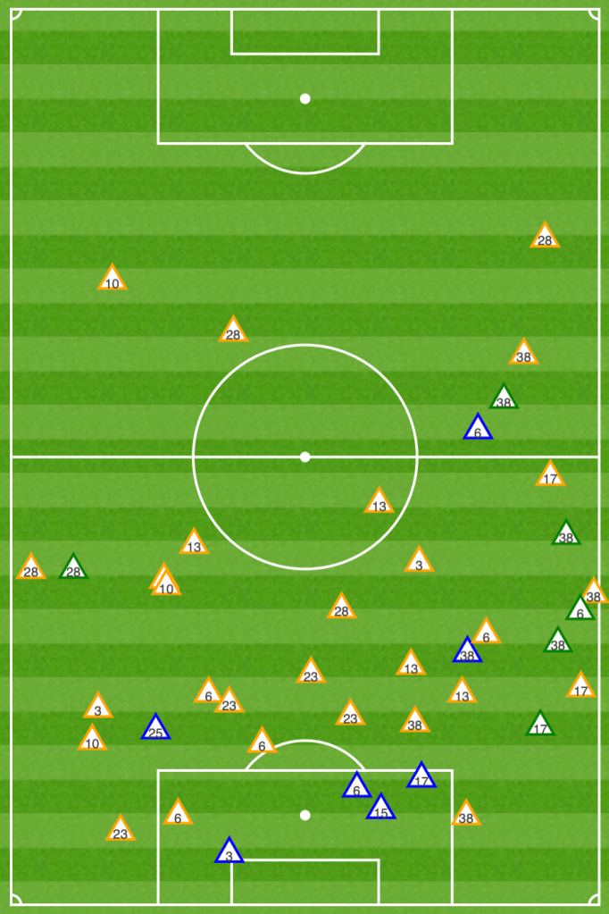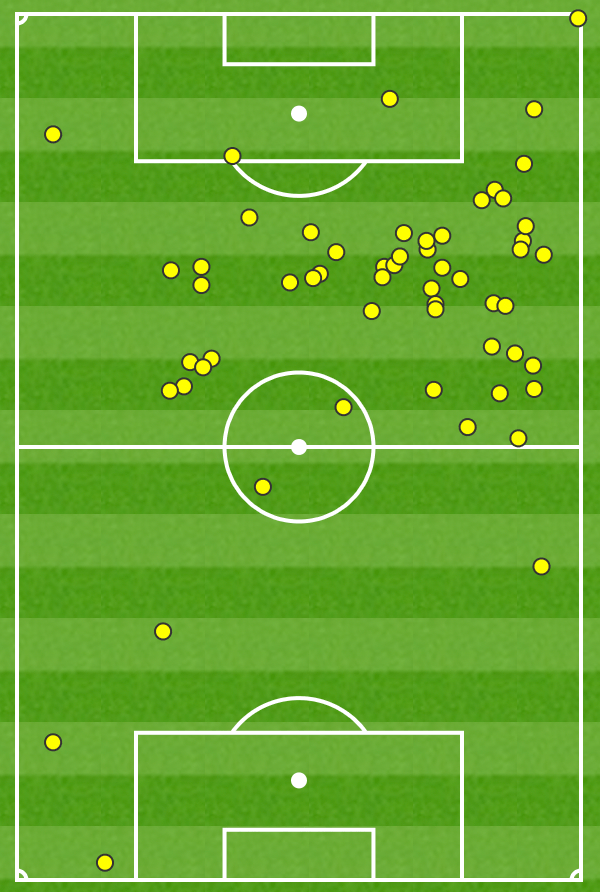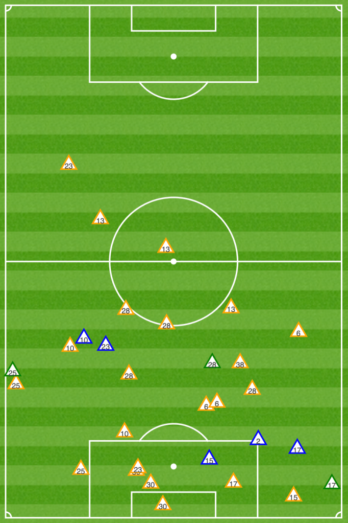 Eso cambió en la segunda etapa, cuando los dirigidos por Pochettino modificaron su enfoque ofensivo y perdieron menos la pelota: según WhoScored.com, en los 45′ iniciales tuvieron 14 de sus 19 pérdidas (por entradas del rival, malos controles o equivocaciones). Con la generación de juego de Messi, que pasó a recibir más centralizado y cerca del área (ver abajo), también llegaron más por los costados a través de Achraf Hakimi y Di María. A partir de una tenencia de mayor calidad -sin ser sobresaliente- y menos réplicas permitidas, consiguieron emparejar el trámite y, finalmente, convertir otro gol tardío para sumar puntos.