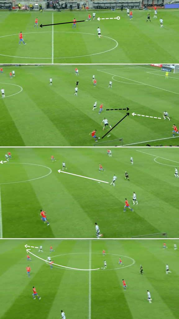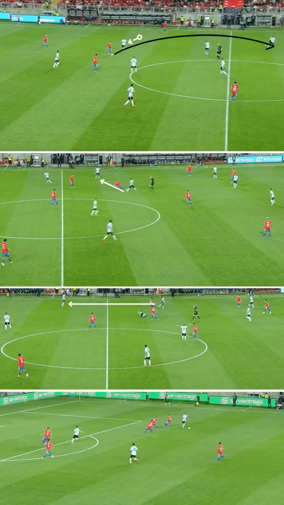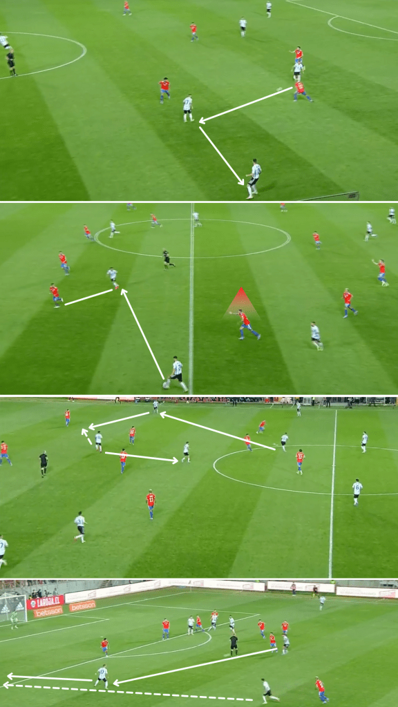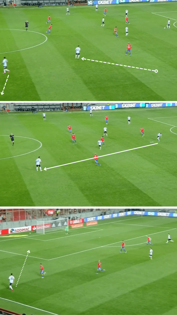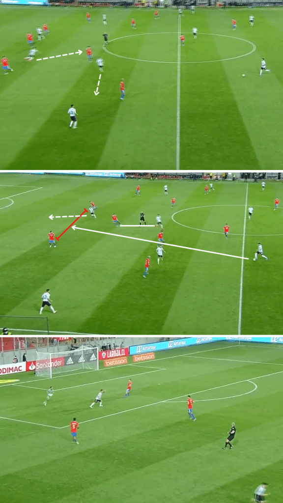 Como en aquel amistoso disputado en San Antonio, Texas, Argentina se agrupó cerca de la mitad de la cancha y decidió apretar en momentos puntuales para quitar y atacar con espacios. Con un trabajo de recuperación liderado por Lautaro Martínez y los dos interiores, quienes se desprendían para ir a buscar a los centrales o a un mediocampista, la Selección cumplió su objetivo en ambos partidos y consiguió trasladar sus avances veloces al marcador: en Estados Unidos lo hizo en tres de sus cuatro gritos, mientras que en Calama se dio en ambas conquistas. Después de forzar errores, como malas entregas o envíos largos, lo que hizo muy bien tanto en Norteamérica como en Chile (ver abajo) fue disponer inmediatamente de al menos una opción en profundidad y luego sumar más alternativas en una “segunda oleada”, siempre con posibilidades de completar los pases -incluso algunos difíciles- a partir del buen pie de sus volantes.